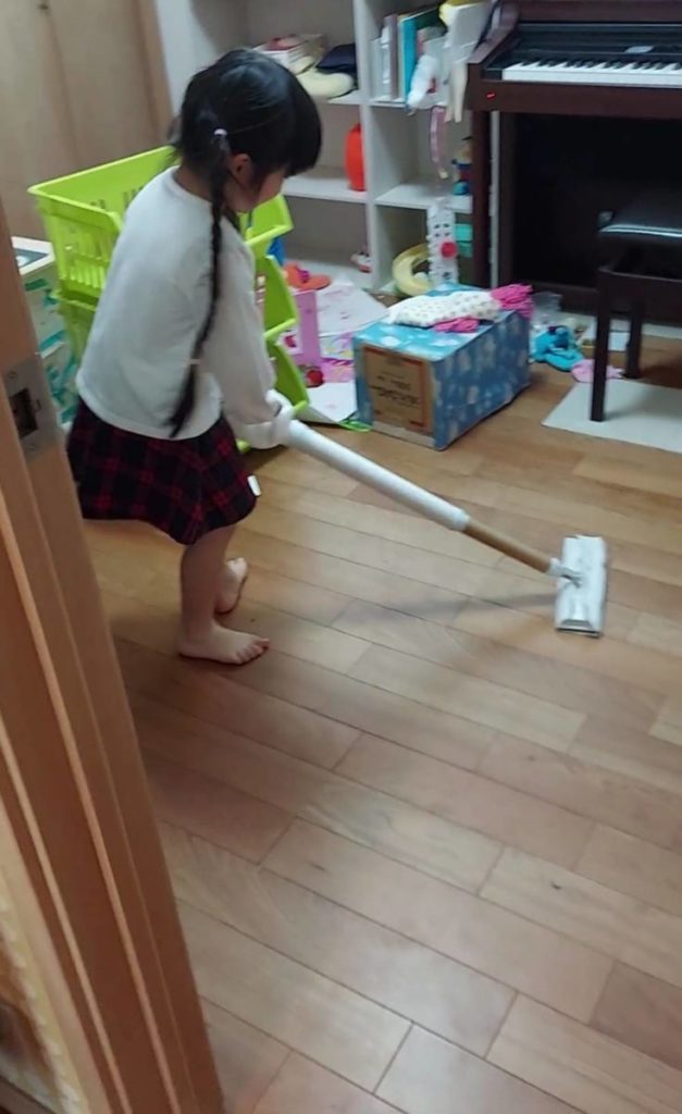 ダイソーで販売されているフローリングワイパーと使用済の紙の芯さえあれば、簡単に『こども用掃除機』が作れました。娘は遊びながら掃除をしてくれて、家もピカピカでママも喜んでいました。