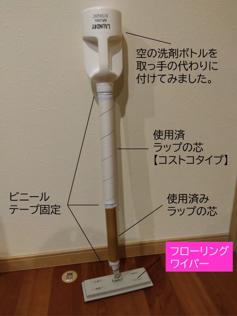 【準備するもの】 ・フローリングワイパー (ダイソー) ・ラップの芯 (筒上の軽い物でも代用可) ・ビニールテープ ※今回は取っ手に洗剤ボトル(ハンズマン) 以前まではダイソーにありましたが今回はなかったので、ホームセンターハンズマンで入手。