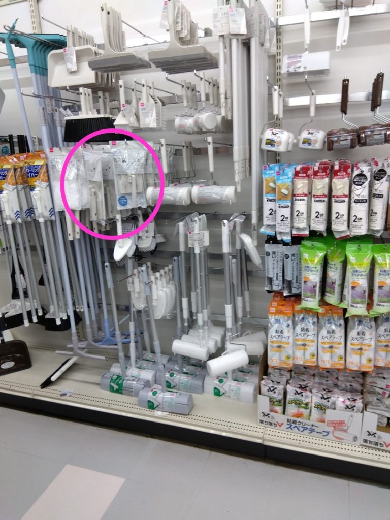 ダイソーのお店の衛生品エリア、洗濯エリアやデッキブラシが置いてあるところにフローリングワイパーがありました。もし、無い場合は店員さんに『フローリングワイパー』がどこにありますか?と聞いた方が早いかもしれません。