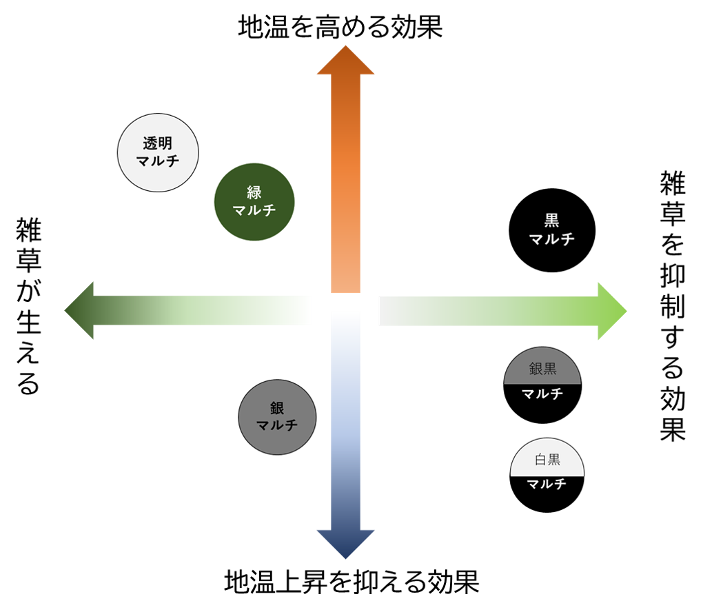 - 透明マルチ 地温上昇効果が最も高いです。光を通してしうため草が生えます。夏季は地温が上がりすぎるので、フィルムの上に敷きワラなど敷いて温度調整が必要です。