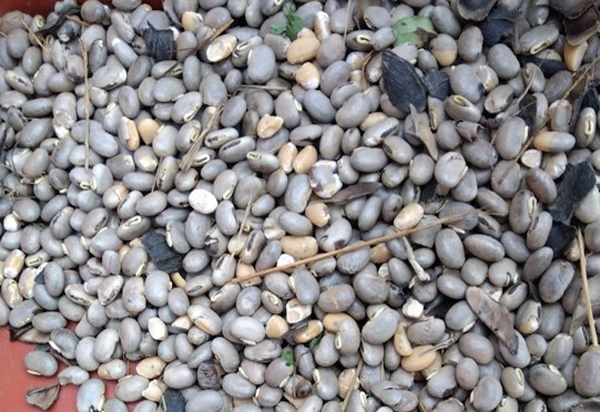 ムクナ豆を脱穀した結果、灰色の状態が良い豆で、黄色のものは灰色の皮が剥がれてしまっています。選別作業が必要な場合もあります。しかし、脱穀機を使用すると1箱約3分程で脱穀でき、人力で割る場合と比べる必要すらないほど速く加工できました。