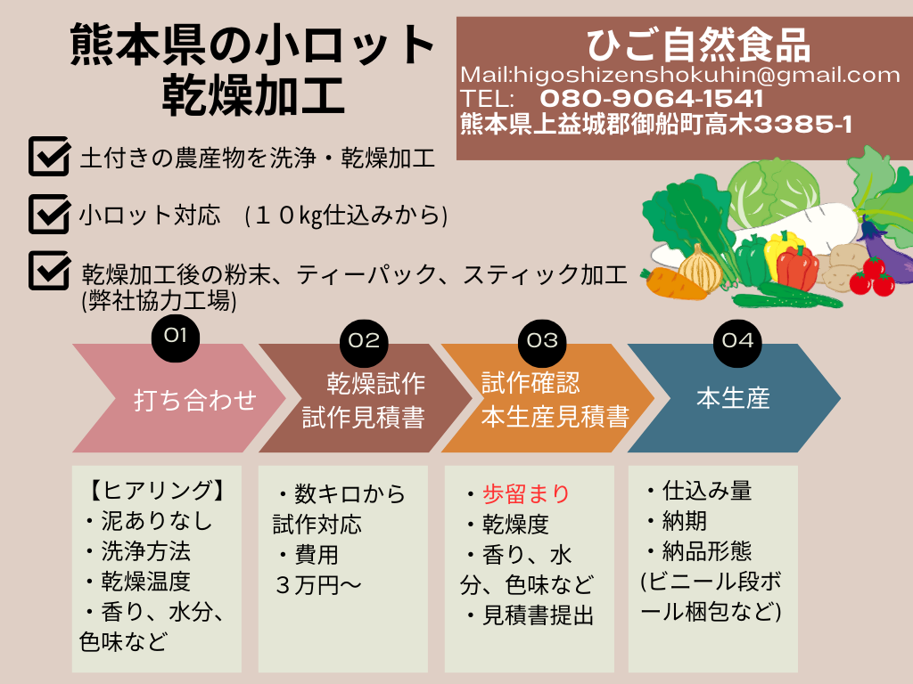 小ロット 農産物 受託乾燥加工 ┃ひご自然食品 雑記 2024.01.212024.11.15 ひご自然食品では熊本県御船町で農産物の小ロット受託加工を行っております。 弊社の乾燥機 農産物の種類によっては投入できる数量が変動します。一度、試作乾燥してから本生産という流れになります。 ご氏名 メールアドレス 題名 メッセージ本文 送れない場合のE-mailはこちら higoshizenshokuhin@gmail.com