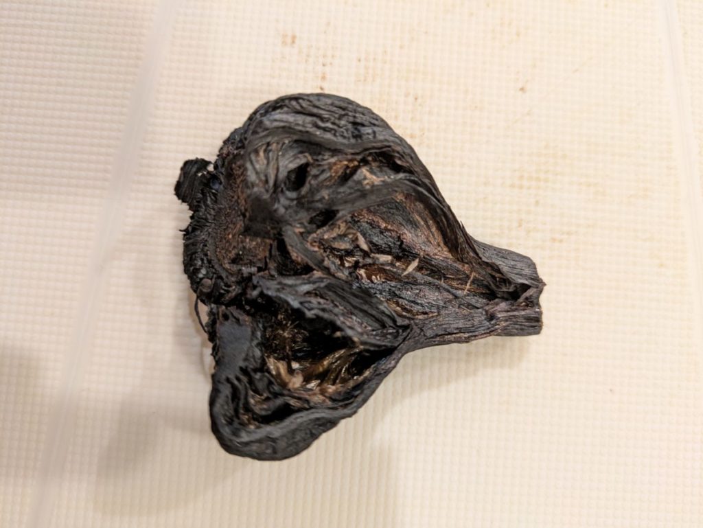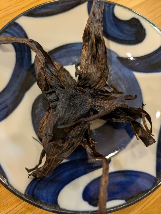 このにんにくは通常のニンニクとして出荷できなかったため、黒にんにくのように熟成させて食べてみました。味は黒にんにくに似ていましたが、少し硬い印象でした。