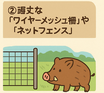 金属の網や強いネットをはって、イノシシが入れないようにします。下にすき間があるとくぐってしまうので、地面にぴったりつけるのがコツです。