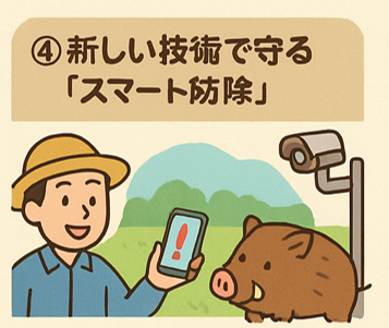 最近はカメラやセンサーを使って、イノシシの動きをスマホで知らせてくれるシステムもあります。夜でも自動で見張ってくれるので、とても安心です。
