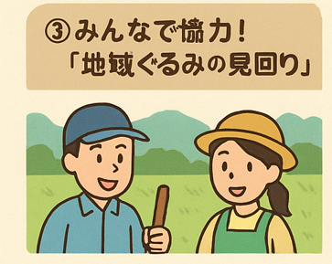 ひとりの力では広い畑を守るのは大変です。そこで、村や集落の人たちがチームをつくって、見回りや追い払いを一緒に行います。力を合わせることで、イノシシが来にくくなります。