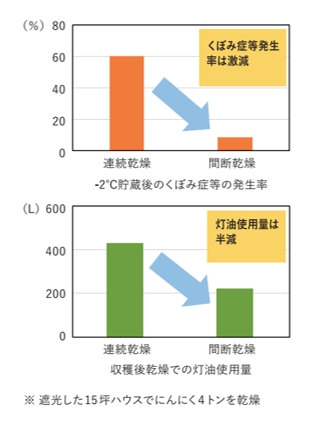 試験結果を見ると、熱風で強制的に水分を早く落としているため、自然乾燥よりも早く乾かせているようです。にんにくは水分を嫌う作物なので、この方法は妥当な方法のように思います。
