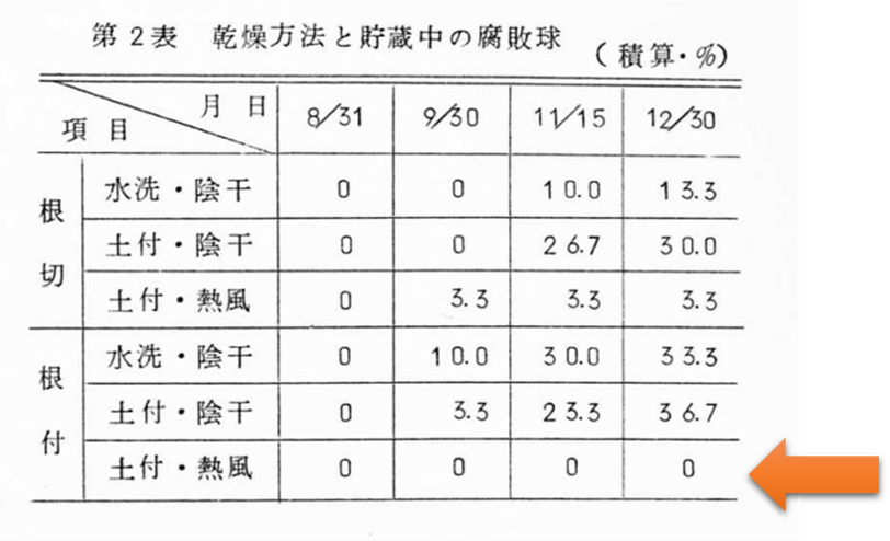 また、泥付き状態で根を切って、熱風で強制乾燥することで、腐敗した球が少ないことがわかりました。(第表2)