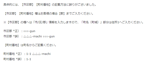 僕の場合は一軒家のパターンで、○○町の記載箇所が間違えていました。一軒家や事務所などの方でエラーメッセージが届いた場合は参考にしてもらえればと思います。