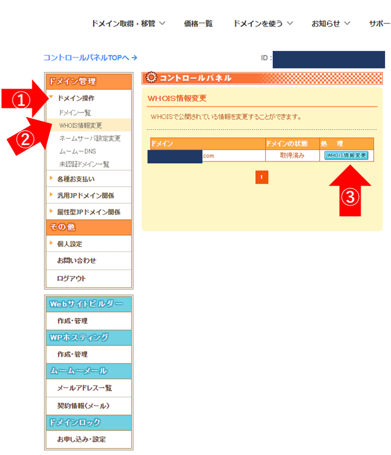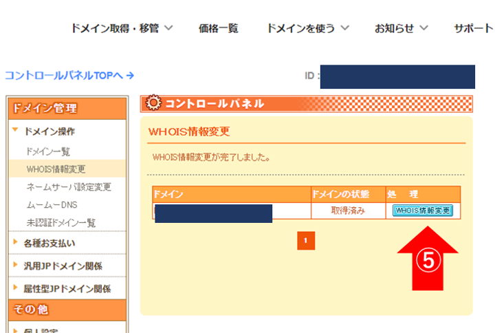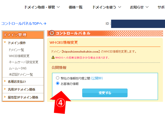 ③右上部のWHOIS情報変更(青ボタン)をクリック