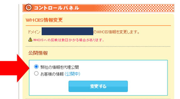 登録情報が間違いないことを確認したら、『弊社情報の情報を代理公開』を選択して