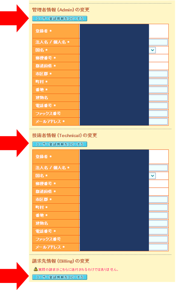 管理者情報 (Admin) 、技術者情報 (Technical) 、請求先情報 (Billing)のそれぞれの『ユーザー登録情報をコピーする』をクリックする。