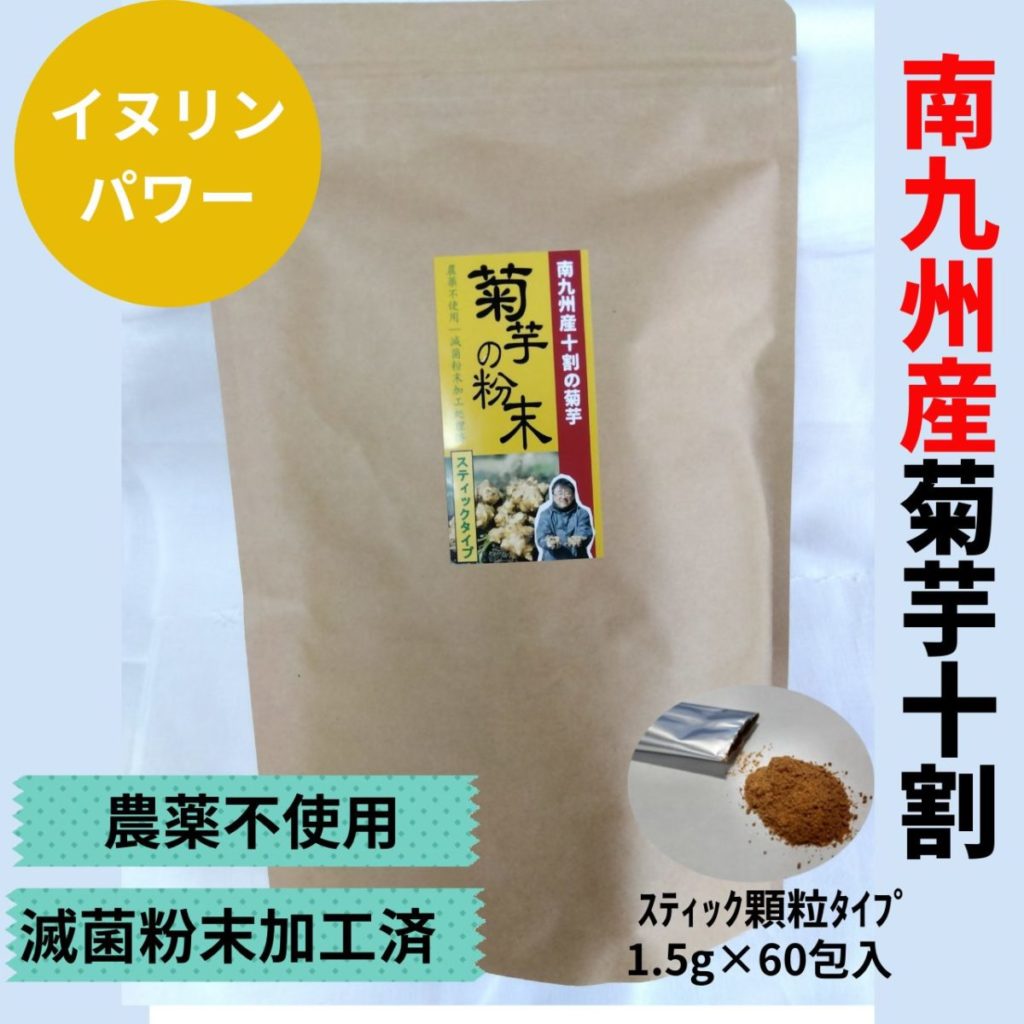菊芋(イヌリン)は「鮮度が命」ということです。なので、菊芋は新鮮なうち(収穫後すぐ)に乾燥加工(当社ではさらに滅菌粉末加工処理しています)をし、乾燥チップスや粉末、菊芋茶などにして摂取するのがおススメなのです。