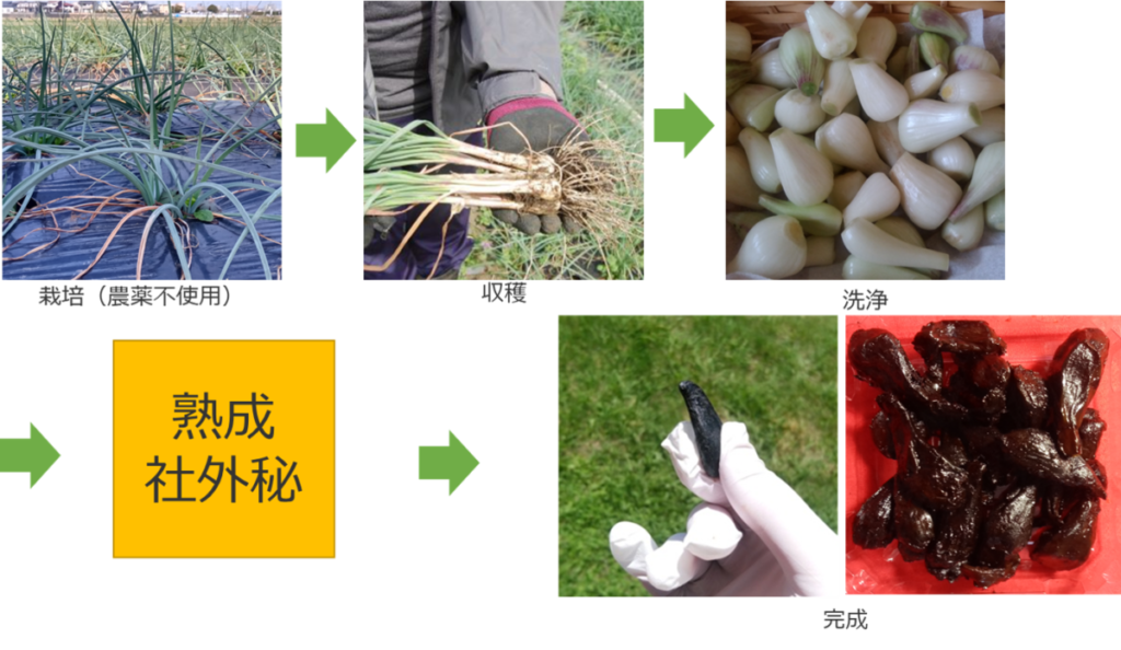 らっきょうを収穫した後に、根っこを切り取って1粒1粒丁寧に洗浄していきます。熟成するとかなりの水分が出ますので、ギュッと濃縮した黒らっきょうが出来上がります。熟成工程で『らっきょう』の味がとても濃ゆくなります。